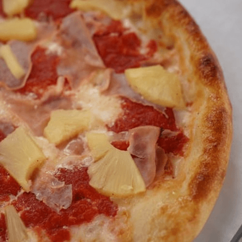 Prosciutto Cotto (Italian Ham), Fresh Cut Pinneaple, Mozzarella, Pizza Sauce.