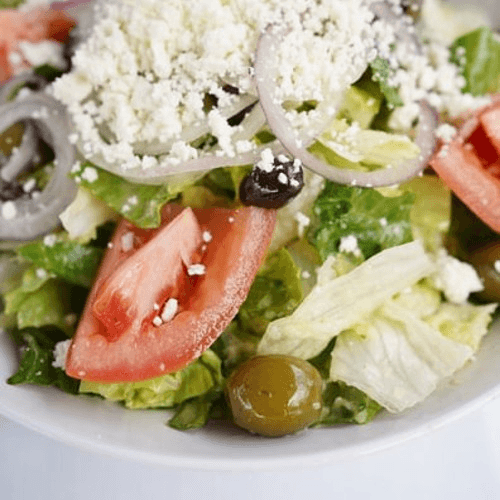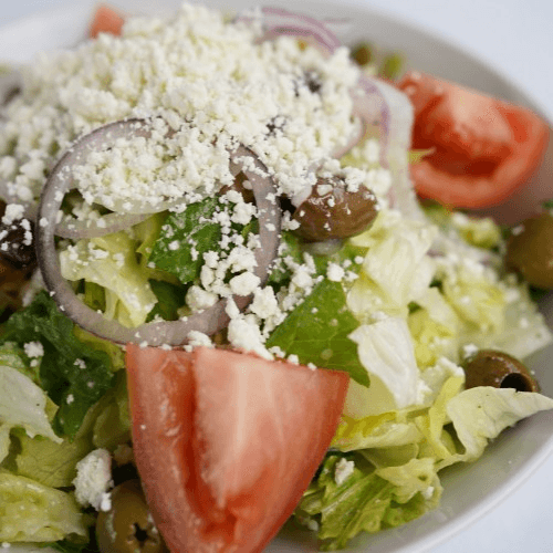 Romaine & Iceberg Lettuce, Tomatoes, Cucumber, Mediterranean Olives, Red Onions, Feta Cheese, Lemon Dressing.