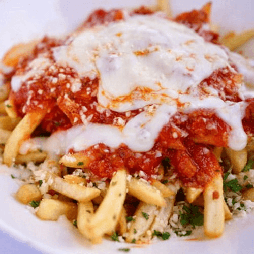 Baked Crispy Fries, Our Own Chili Meat Sauce, Parmesan, Shredded Mozzarella