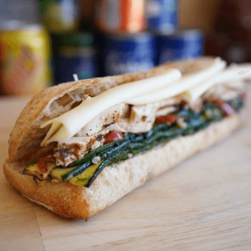 Grilled Zucchini, Roasted Bell Peppers, Grilled Chicken, Smoked Mozzarella Cheese. Served with Chips & Soft Drink