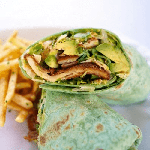 Crispy Chicken, Avocado, Spinach Tortilla, Chopped Lettuce, House Dressing, Hot Sauce. Served with Chips & Soft Drink