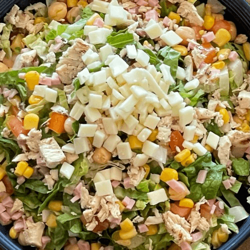 Chopped Lettuces, Ham, Chicken, Garbanzo, Corn, Tomatoes, Cheese, Lemon Dressing