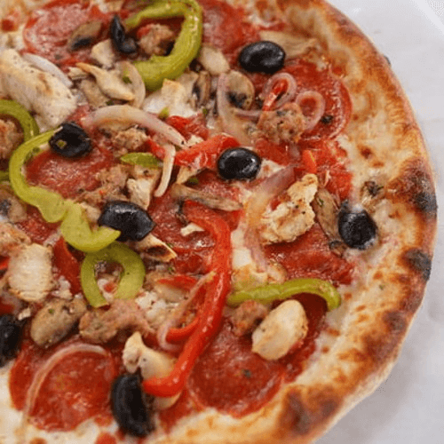 Pepperoni, Sausage, Chicken, Mozzarella, Bell Peppers, Mushrooms, Red Onion, Black Olives, House Made Pizza Sauce