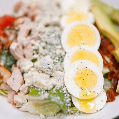 A Medley of Romaine & Iceberg Lettuce, Diced Tomatoes, Avocado, Crispy Bacon, Blue Cheese, Hard Boiled Egg, Ranch Dressing.