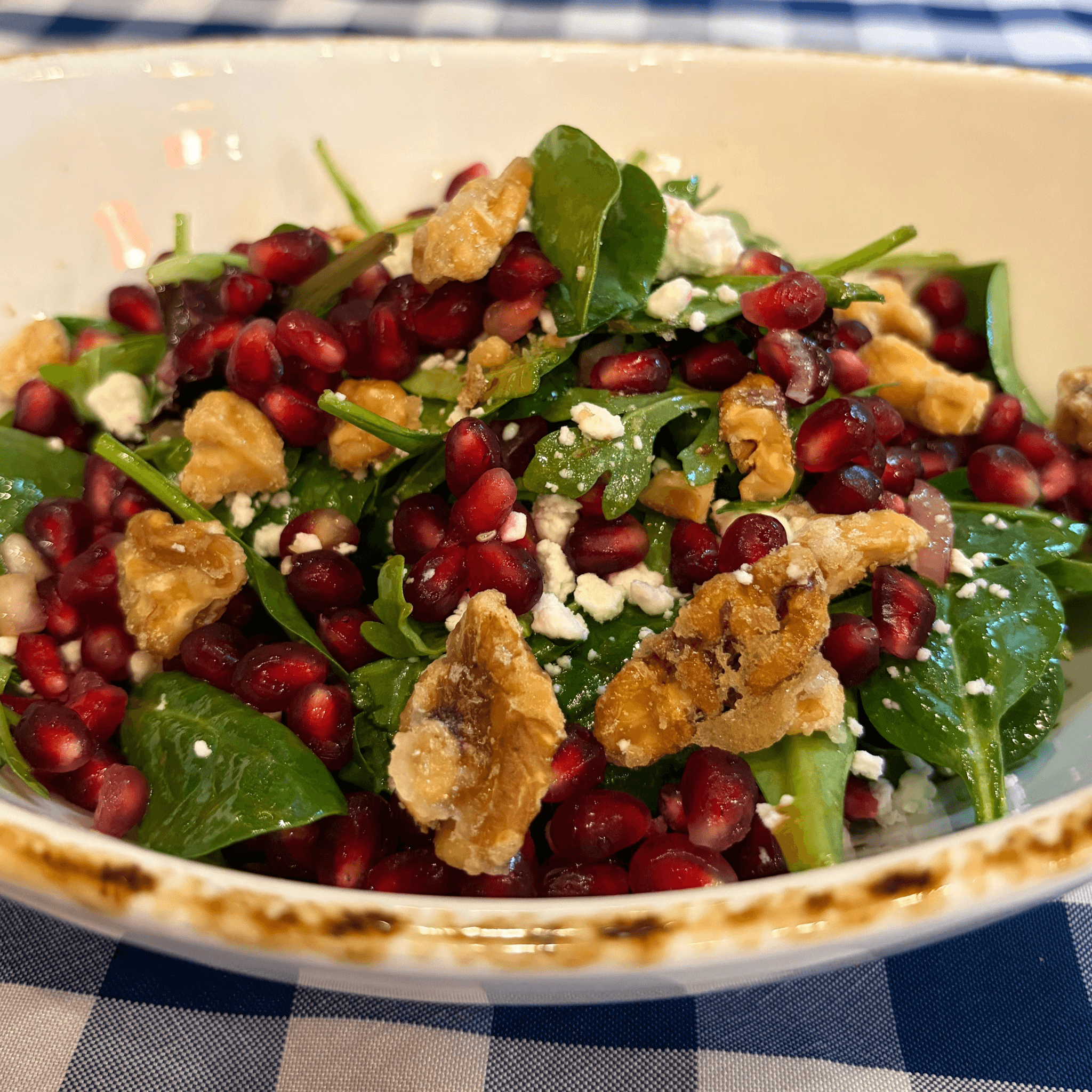 Arugula, Mixed Greens, Baby Spinach, Sweet Onions, Caramelized Walnuts, Goat Cheese, Fresh Pomegranate, Balsamic Vinaigrette
