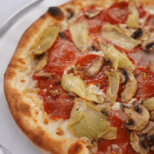 Mozzarella, House Made Pizza Sauce, Italian Ham, Pepperoni, Sauteed Artichokes & Mushrooms
